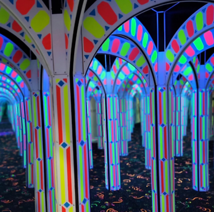 Ever dreamed of diving into a mind-bending adventure through a maze that feels like stepping inside your favorite spy movie, complete with music and glowing black lights? Your dream is now a reality with our Mirror Maze!