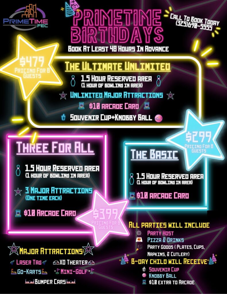 Make your birthday an epic celebration at PrimeTime! Our Birthday Party packages are designed for a day filled with laughter, games, and fantastic memories. Choose from a variety of attractions, enjoy delicious catering options, and let our party experts take care of every detail.